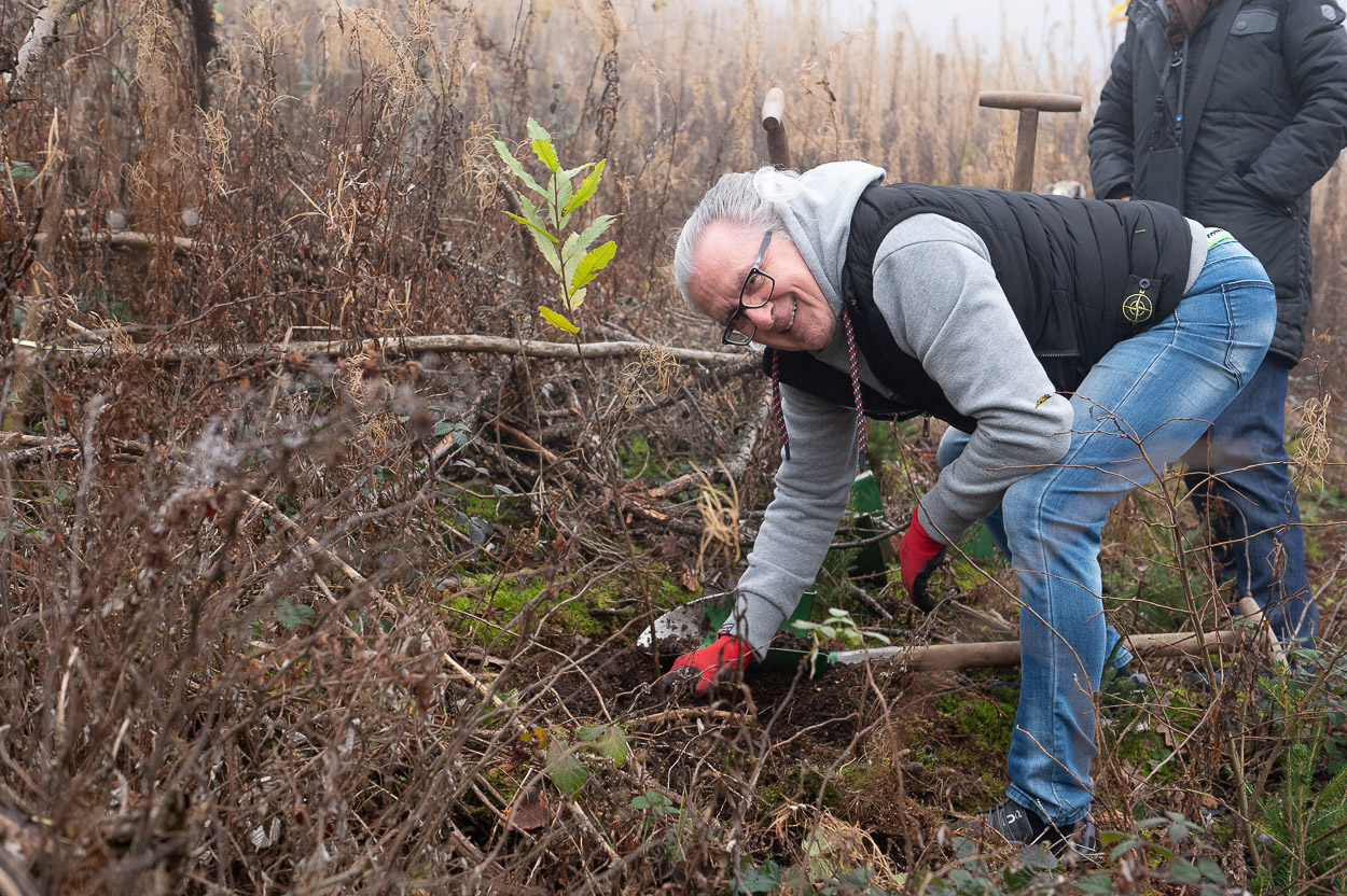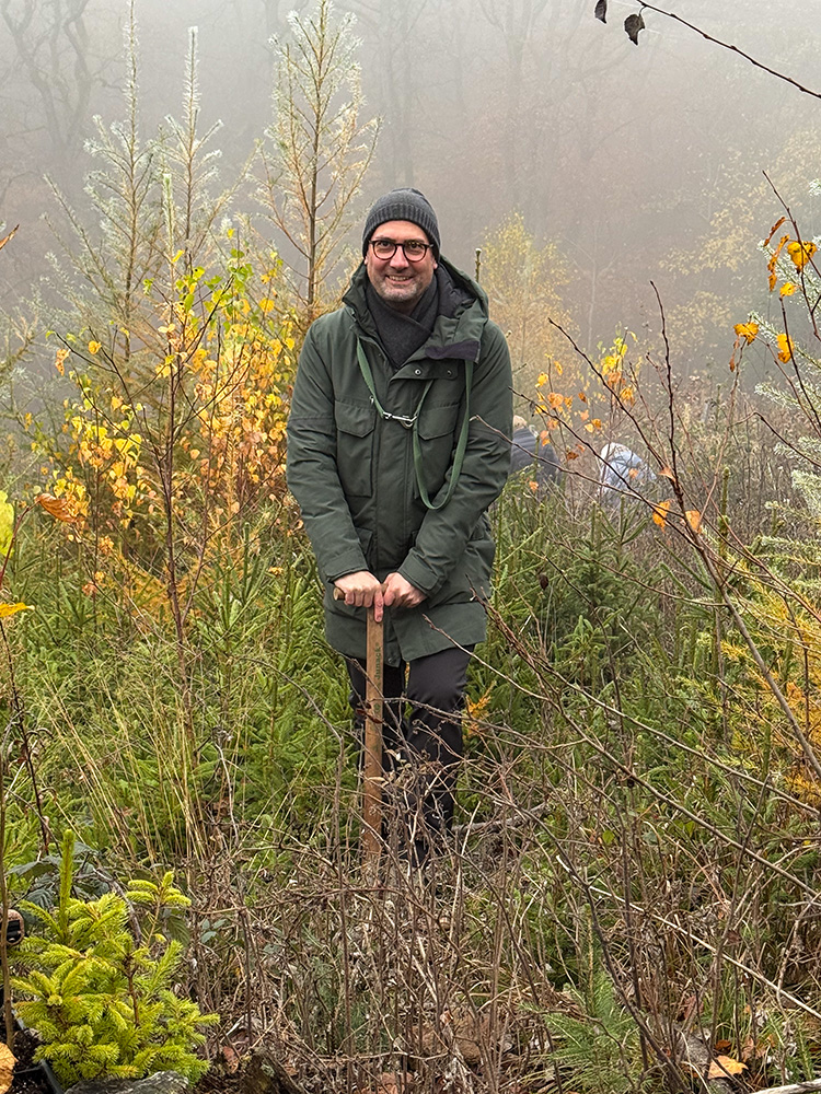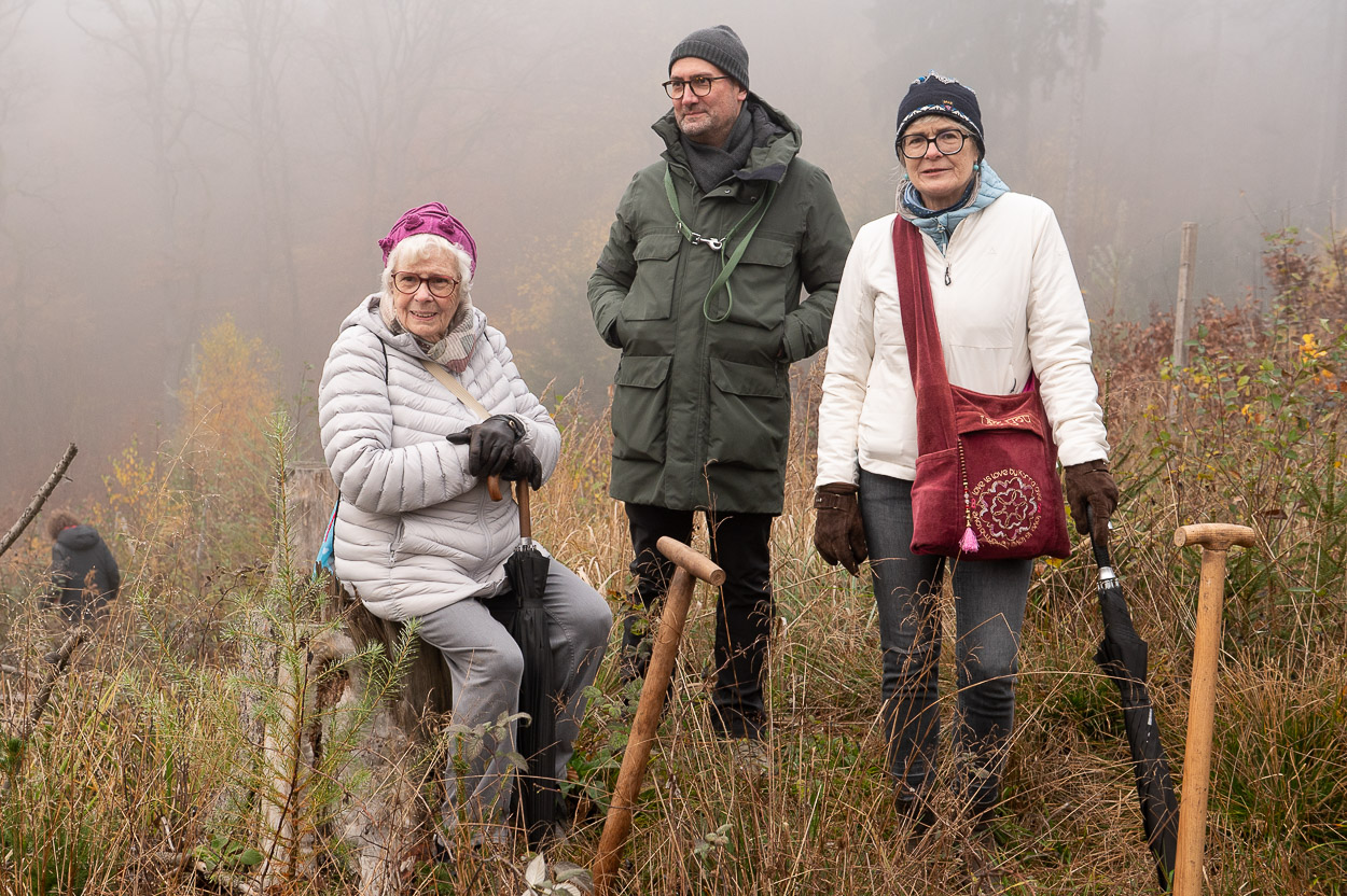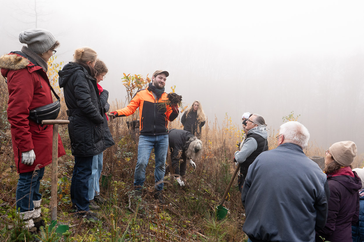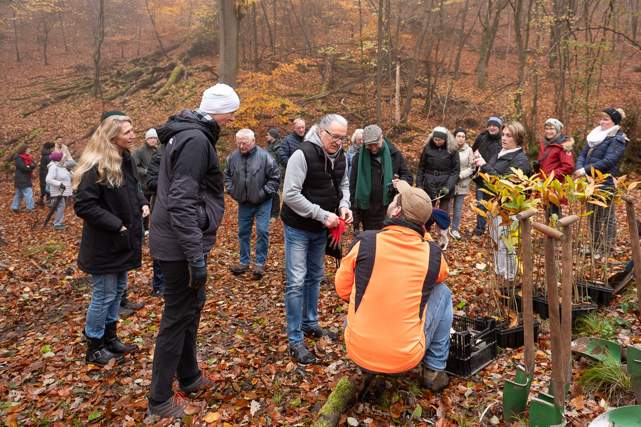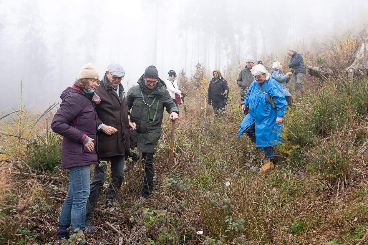 Rund 30 Teilnehmende haben sich am 8. November 2025 an der Wambacher Mühle in Schlangenbad im Taunus eingefunden. Nach einer Einführung von Jan Borchert, Klimaförster und Co-Founder und Geschäftsführer von Planted HQ gGmbH, ging es in den Wald. Dort „trafen“ wir die jungen Bäume, die wir ein Jahr zuvor gepflanzt haben. Diesmal hat die Gruppe 70 junge Bäumchen unter fachlicher Anleitung von Jan Borchert gepflanzt. Damit haben wir einen Beitrag dazu geleistet, dass der Hang eines Tages wieder ein Stück Waldgebiet ist. Hier standen einst Fichten, die der Borkenkäfer so beschädigt hat, dass sie gefällt werden mussten.