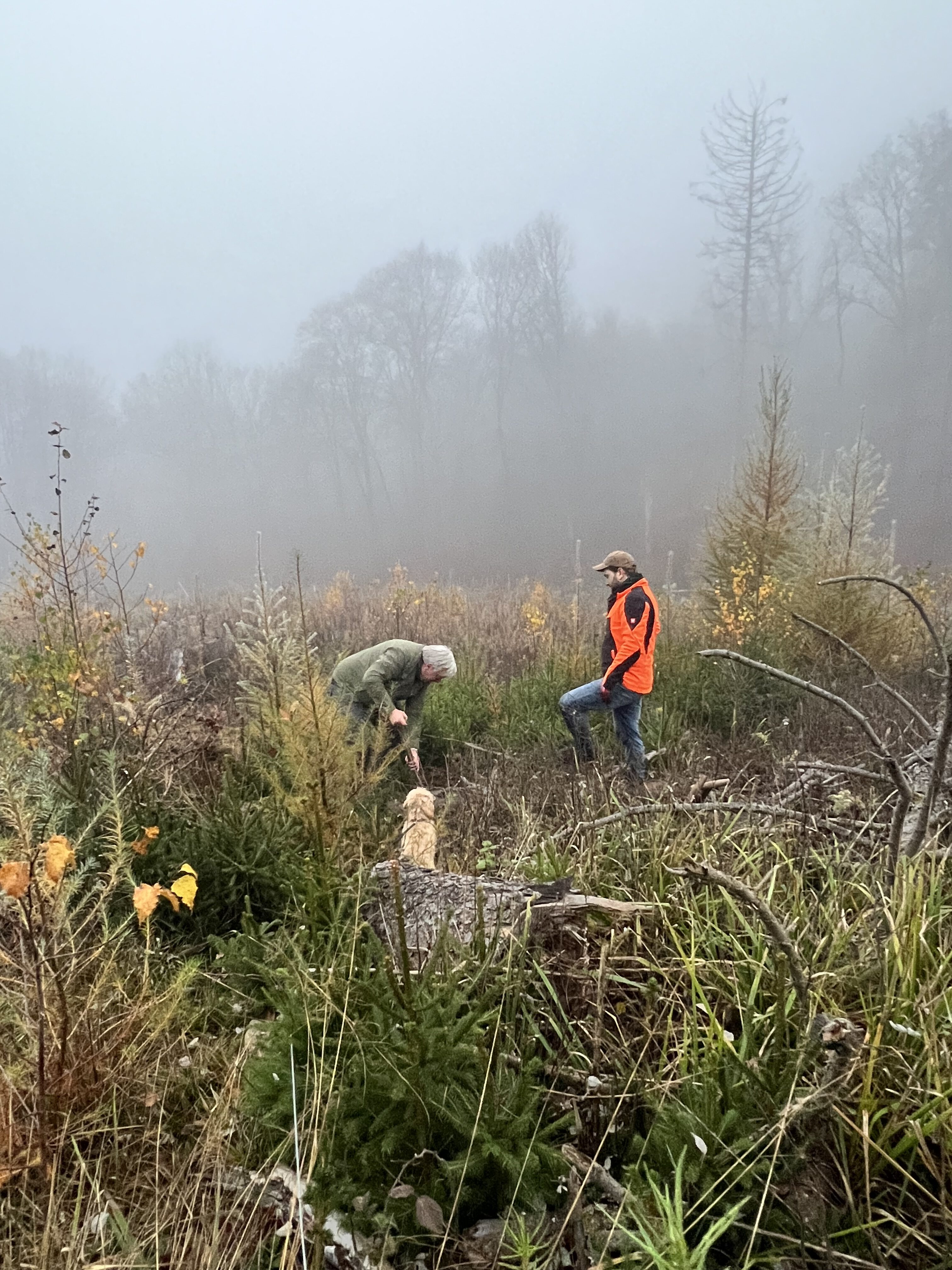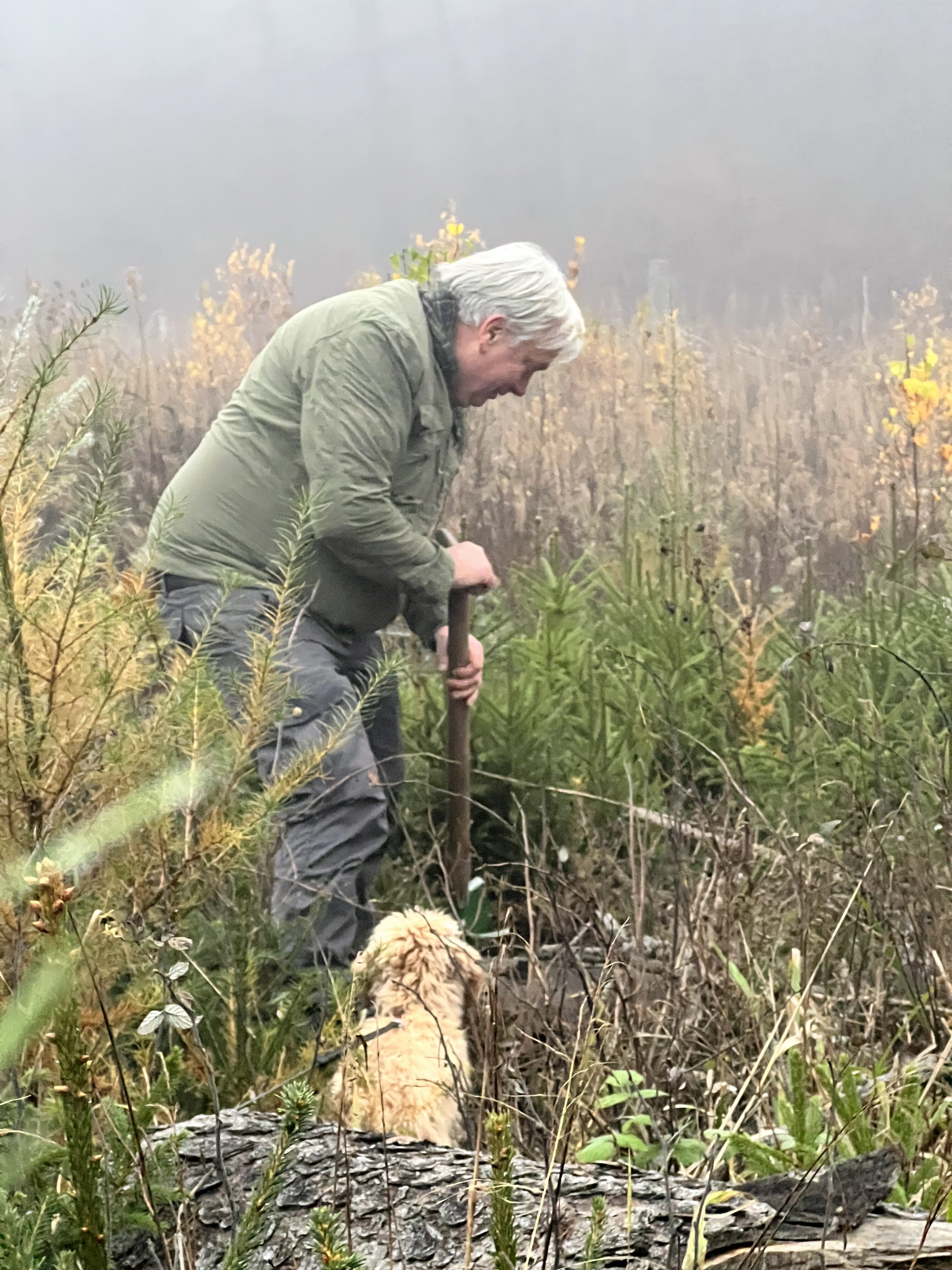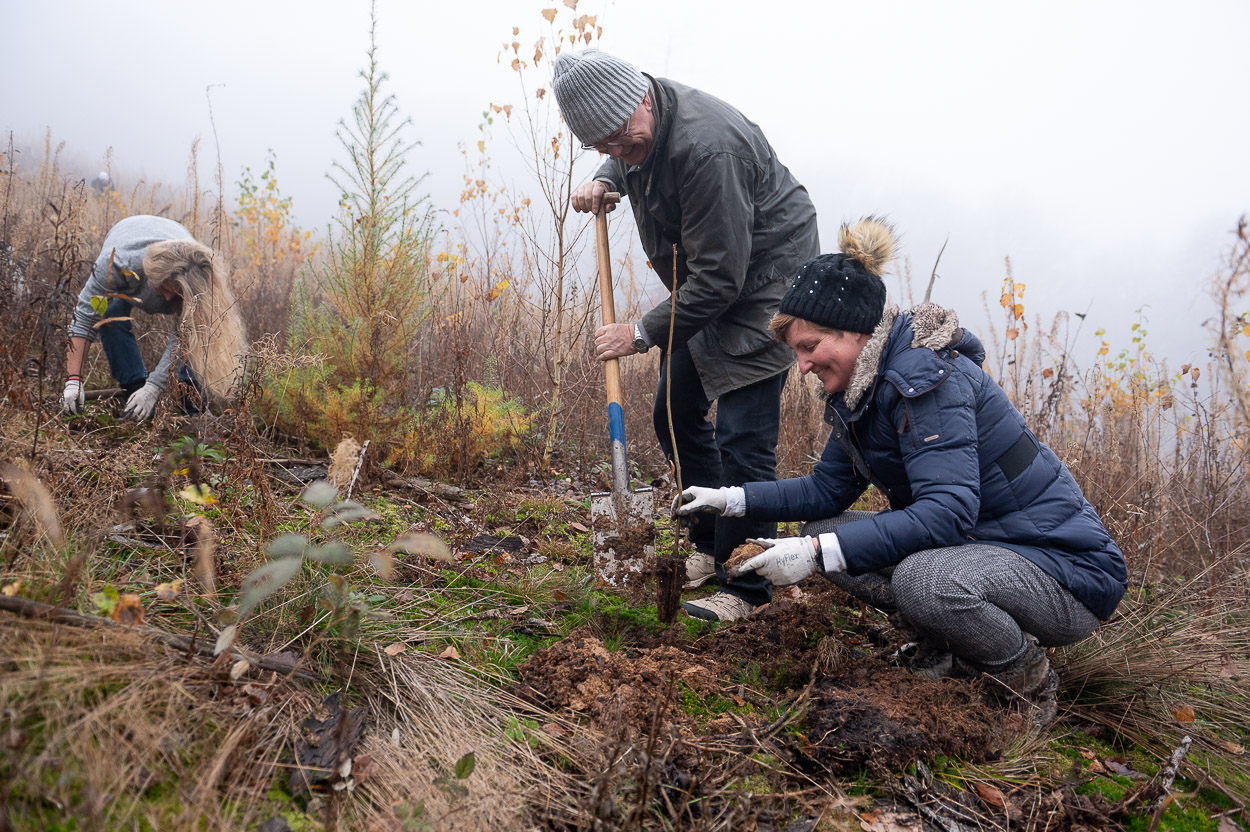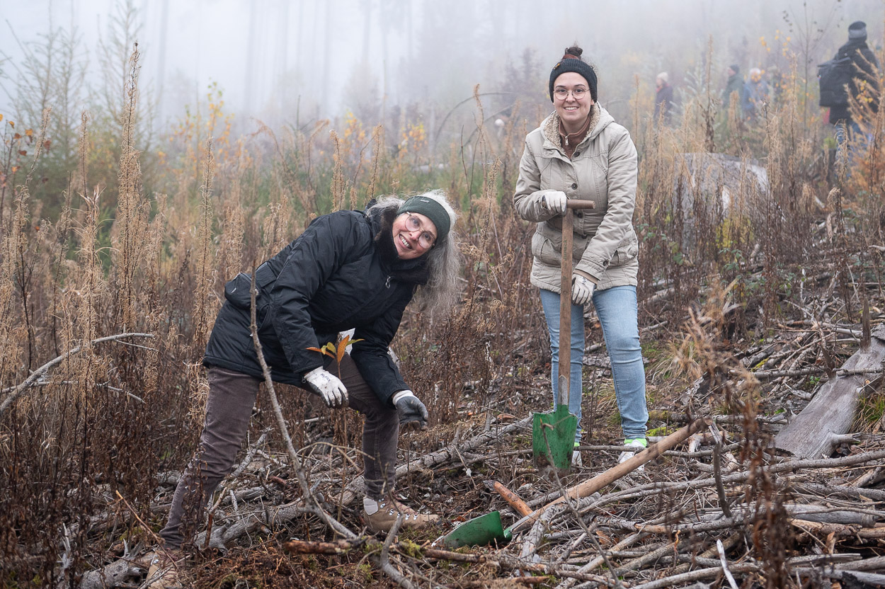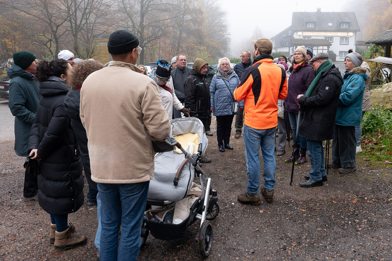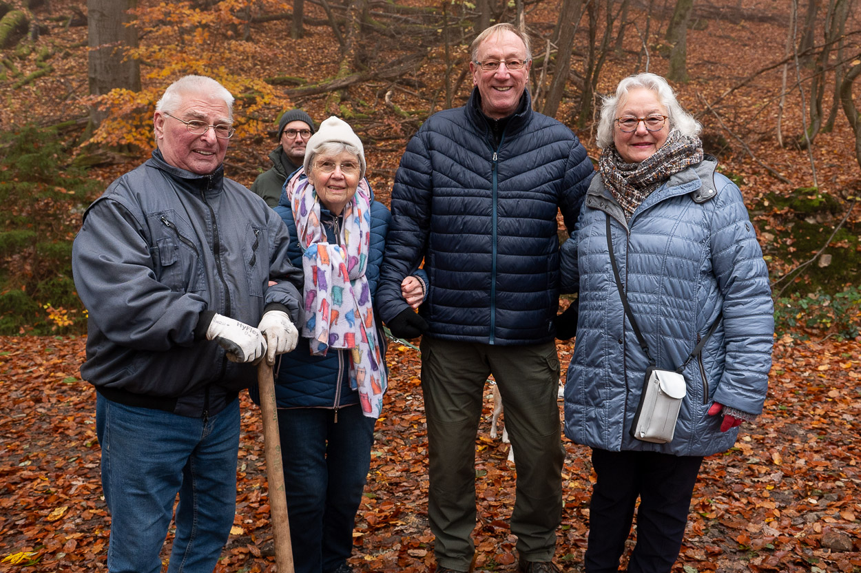 Rund 30 Teilnehmende haben sich am 8. November 2025 an der Wambacher Mühle in Schlangenbad im Taunus eingefunden. Nach einer Einführung von Jan Borchert, Klimaförster und Co-Founder und Geschäftsführer von Planted HQ gGmbH, ging es in den Wald. Dort „trafen“ wir die jungen Bäume, die wir ein Jahr zuvor gepflanzt haben. Diesmal hat die Gruppe 70 junge Bäumchen unter fachlicher Anleitung von Jan Borchert gepflanzt. Damit haben wir einen Beitrag dazu geleistet, dass der Hang eines Tages wieder ein Stück Waldgebiet ist. Hier standen einst Fichten, die der Borkenkäfer so beschädigt hat, dass sie gefällt werden mussten.