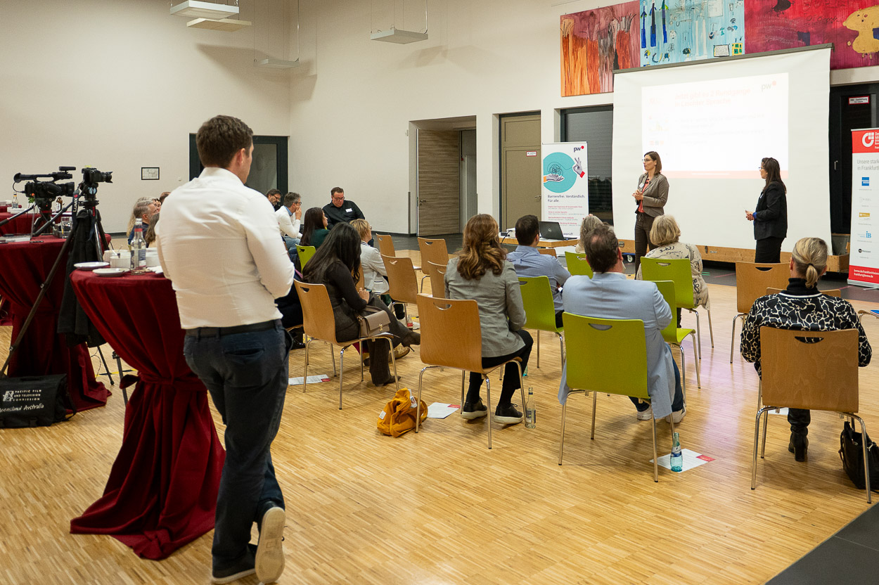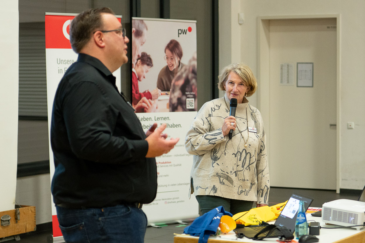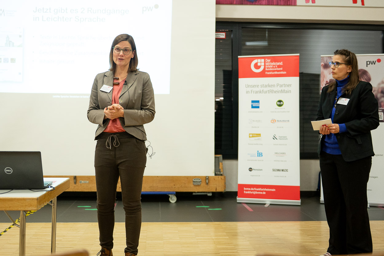 Sandra Heep und Maren Forner (Praunheimer Werkstätten – PW) zeigen den zweiten Hebel: Verständnis. Wer Websites, Shops, Broschüren und Prozesse barrierefrei gestaltet, erreicht mehr Menschen. Ein Beispiel ist das Historische Museum Frankfurt: Rundgänge in leichter Sprache, kurze, mehrfach erklärte Zusammenhänge, zusätzliche Einordnungen, Piktogramme/Bilder. KI hilft da noch nicht ausreichend. Deshalb testen die PW die Angebote ihrer Kunden weiterhin mit echten Prüfpersonen, die ganz unterschiedlich beeinträchtigt sind.