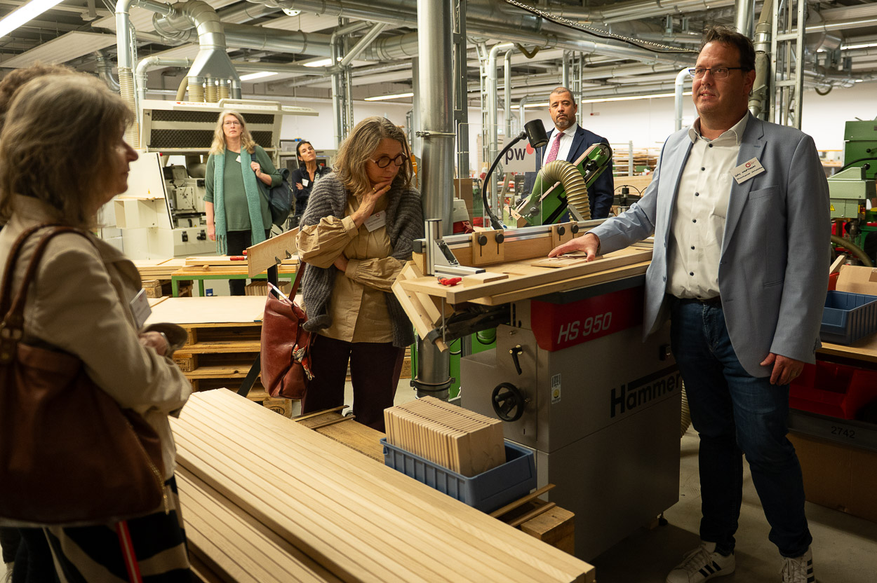 Beim Rundgang durch Schreinerei, Montage und Lager der Praunheimer Werkstätten wird sichtbar, wie mit ideenreichen, individuell zugeschnittenen Hilfsmitteln Kundenanforderungen präzise von den Beschäftigten mit Beeinträchtigungen umgesetzt werden. Kreative Lösungen, Hürden abbauen und Qualität erhöhen.